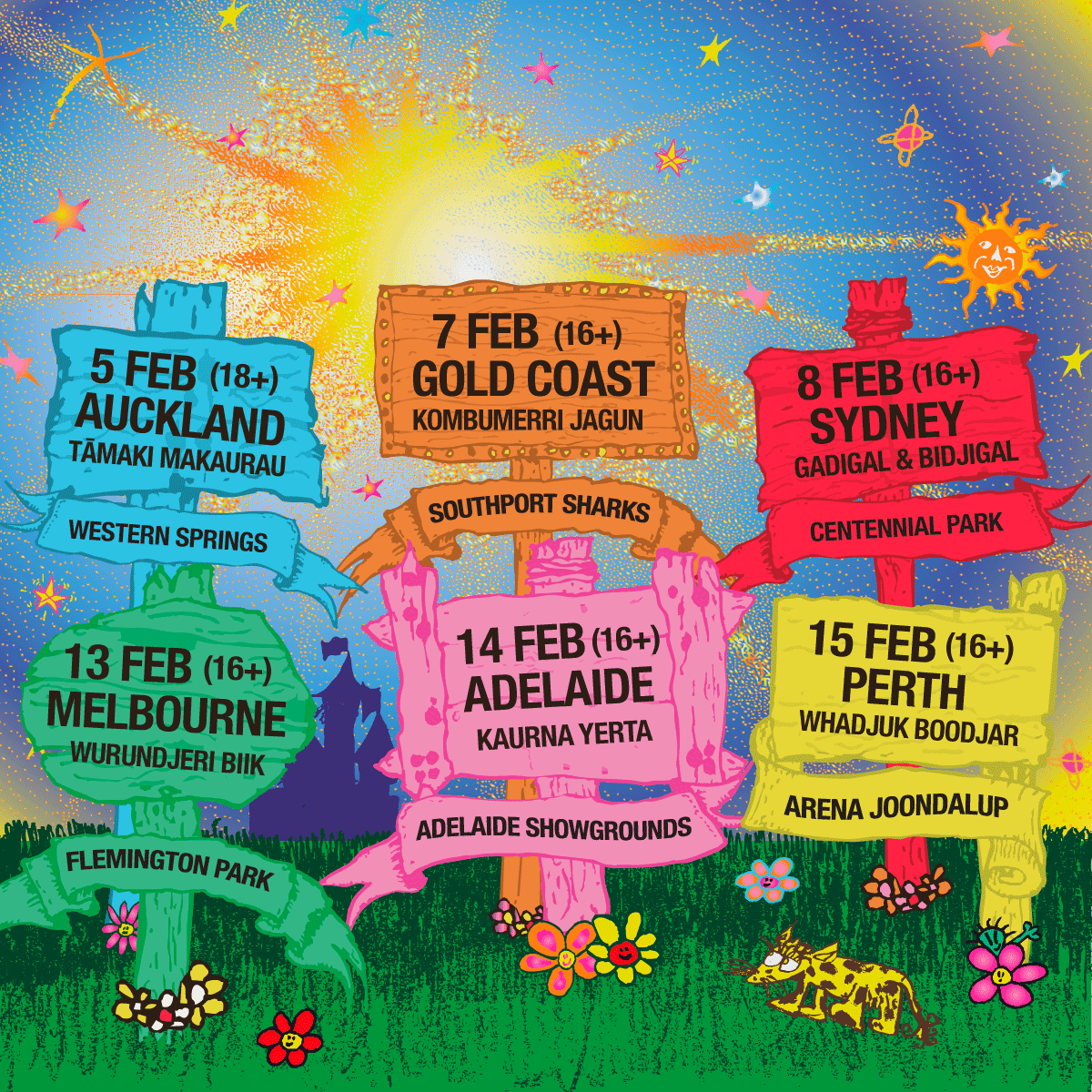 AUCKLAND | Tāmaki Makaurau – Thu 5 Feb – Western Springs (18+) GOLD COAST | Kombumerri Jagun – Sat 7 Feb – Southport Sharks (16+) SYDNEY | Gadigal & Bidjigal – Sun 8 Feb – Centennial Park (16+) MELBOURNE | Wurundjeri Biik – Fri 13 Feb – Flemington Park (16+) ADELAIDE | Kaurna Yerta – Sat 14 Feb – Adelaide Showgrounds (16+) PERTH | Whadjuk Boodjar – Sun 15 Feb – Arena Joondalup (16+) |