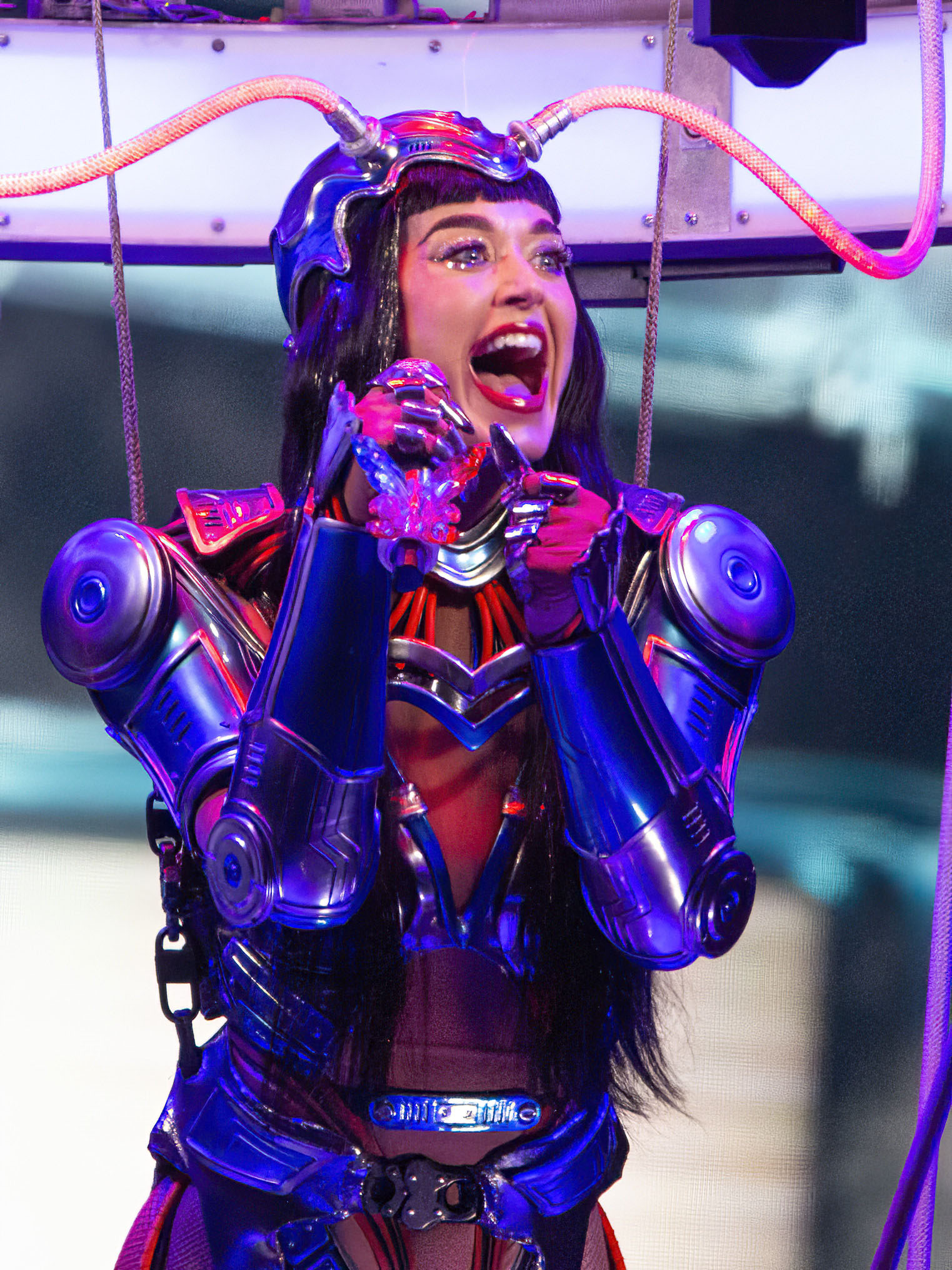 The stage is cleared for a posse of alien creatures to stalk around the stage with beautifully angular choreography, before Katy emerges half way down the arena to fight them – part pop star, part superhero. More spectacular wire performances to a thumping arrangement of E.T., turn this into an even more epic performance, like super-charged capoeira but with lightsabers.